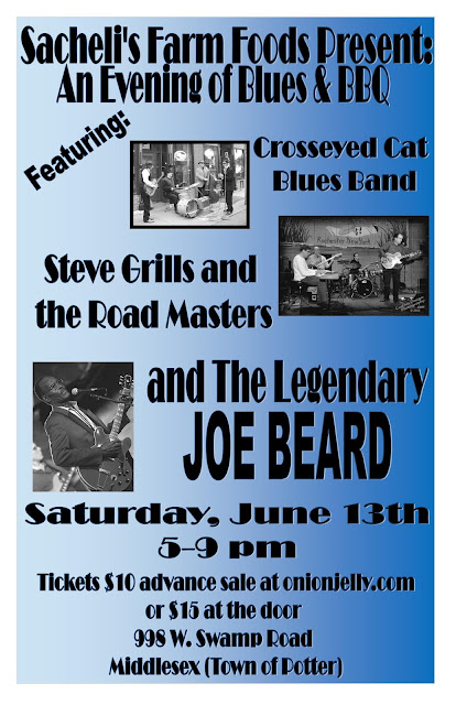 Sacheli’s Farm Foods Present a night of Blues and BBQ (some of the proceeds to benefit the Marcus Whitman ECO Program). Saturday, June 13 – doors open at 4:00 for BBQ and bands will start promptly at 5 pm. Music will be provided by Crosseyed Cat Blues Band from Potter; Steve Grills and the Roadmasters from Rochester and the Legendary Joe Beard. Chicken and Pulled Pork BBQ will be provided by Sacheli’s Farm Bistro Bus. Local Beer and Wine, and Moo Moon Chocolates beer and wine infused artisan chocolates will also be available. Advance Sale Concert Tickets are available for $10 at www.onionjelly.com, the Sacheli Family’s Onion Jelly Booth at the Canandaigua Farmer’s Market and Area Records- Geneva, Rossi’s Music- Canandaigua or $15 at the door. This event will be held inside at Sacheli’s Farm, 998 West Swamp Road, Middlesex. For further information visit onionjelly.com.Lucian Sacheli